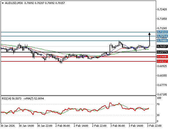 Technical View: مركز شراء طويل فوق 0.6977. الهدف 0.7048. الإحتمال البديل كسر تحت 0.6977, لفتح 0.6949.