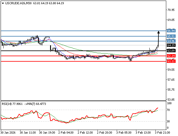 | النفط الأمريكي الخام | 03-02-2026 20:55:00 GMT | المدى القصير | مرجح الصعود ![]() | 64.19 | 63.09 | 64.96 |