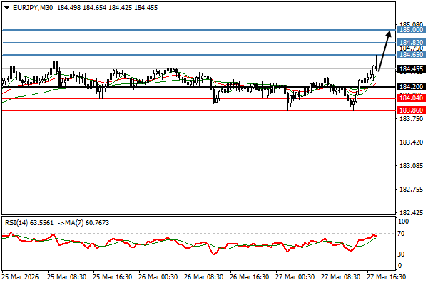 | يورو/ين | 27-03-2026 16:17:00 GMT | المدى القصير | مرجح الصعود ![]() | 184.45 | 184.20 | 184.65 |