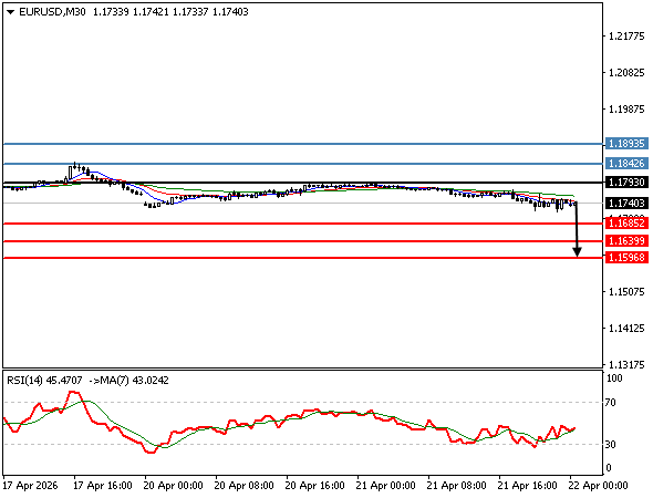 | يورو/دولار | 21-04-2026 22:13:00 GMT | المدى القصير | مرجح النزول ![]() | 1.1740 | 1.1685 | 1.1793 |