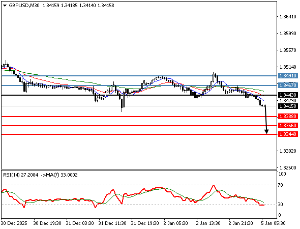 | أسترليني/دولار | 02-01-2026 11:41:00 GMT | المدى القصير | مرجح النزول ![]() | 1.3438 | 1.3426 | 1.3455 |