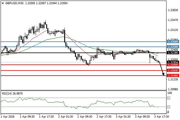 | أسترليني/دولار | 02-04-2026 23:10:00 GMT | المدى القصير | مرجح النزول ![]() | 1.3226 | 1.3197 | 1.3244 |
