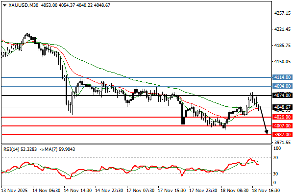 | الذهب | 18-11-2025 16:11:00 GMT | المدى القصير | مرجح النزول ![]() | 4048 | 4026 | 4074 |