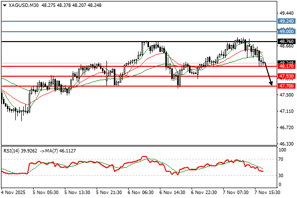 | الفضة | 07-11-2025 15:41:00 GMT | المدى القصير | مرجح النزول ![]() | 48.24 | 48.17 | 48.76 |