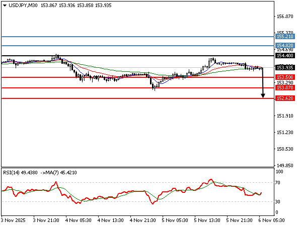 | دولار/ين | 06-11-2025 04:20:00 GMT | المدى القصير | مرجح النزول ![]() | 153.93 | 153.50 | 154.40 |