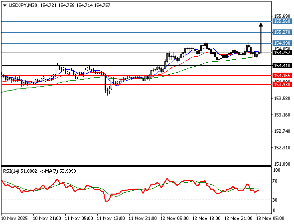 | دولار/ين | 13-11-2025 04:15:00 GMT | المدى القصير | مرجح الصعود ![]() | 154.75 | 154.41 | 154.99 |