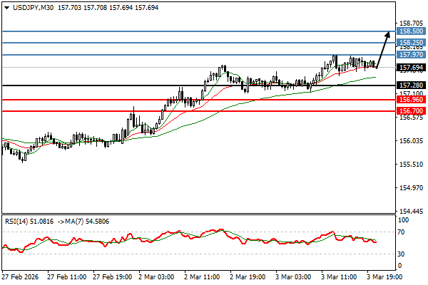 | دولار/ين | 03-03-2026 18:30:00 GMT | المدى القصير | مرجح الصعود ![]() | 157.69 | 157.28 | 157.97 |