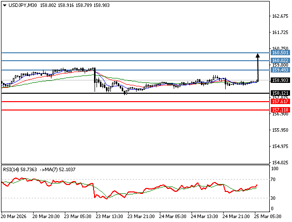 | دولار/ين | 25-03-2026 04:32:00 GMT | المدى القصير | مرجح الصعود ![]() | 158.90 | 158.12 | 159.49 |