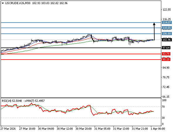 | CRUDE OIL | 31-03-2026 08:35:00 GMT | Short Term | Upside favored ![]() | 102.44 | 100.64 | 106.77 |